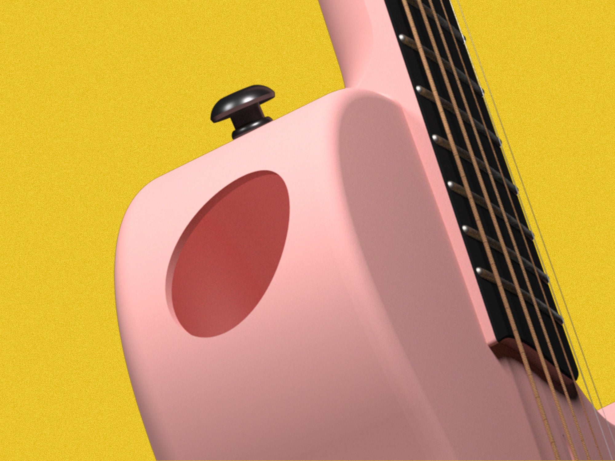 The body of this Nova Go guitar is half-sized, molded all in one piece, meaning that the bridge is a cohesive part of the top, not glued upon like traditional acoustic guitars. It would never pop off. We've also put a truss rod into the neck, giving more adjustability for the string action.